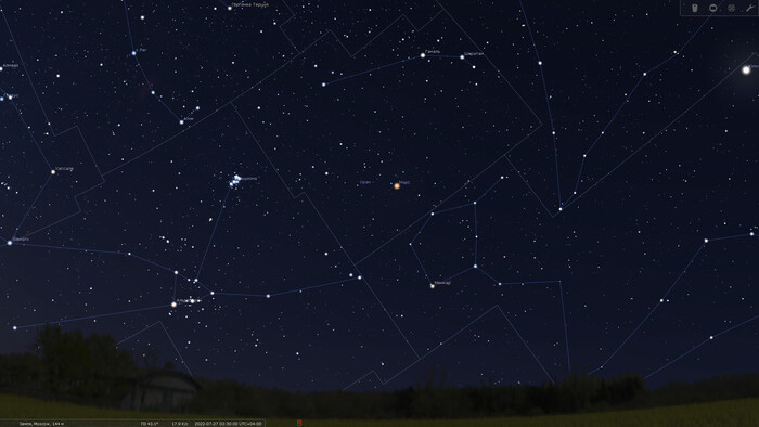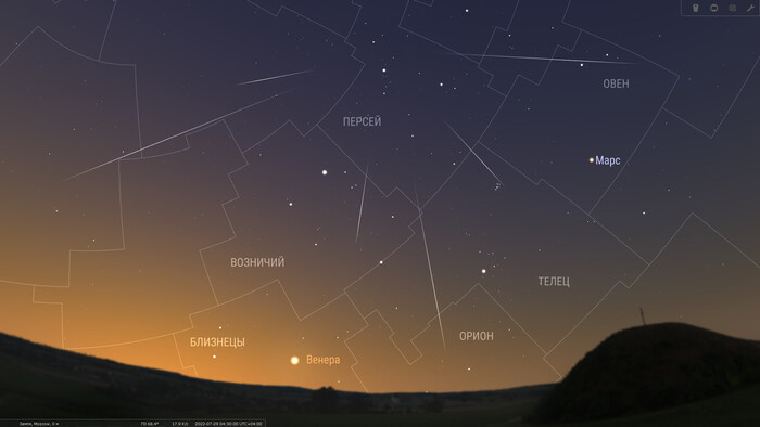 Не забывайте о том, что над созвездием Тельца, украшенном звездными скоплениями Плеяды, Гиады и яркой звездой Альдебаран, расположен радиант метеорного потока Персеиды — в созвездии Персея, как можно догадаться. В эту и многие последующие ночи высока вероятность увидеть несколько “падающих звезд” — метеоров, которыми так богат август. Максимум активности метеорного потока Персеиды придется на период с 11 по 13 августа. Но уже сейчас поток достаточно заметен