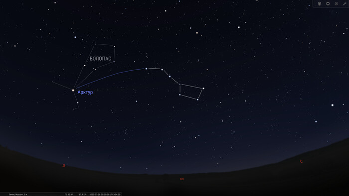 Если продлить ручку Ковша с легким изгибом, мы найдем яркую оранжевую звезду Арктур — альфу созвездия Волопас. Созвездие Волопаса располагается на Арктуром — 5 звезд средней яркости, и еще несколько вблизи Арктура и чуть ниже него. Некоторые наблюдатели сравнивают фигуру Волопаса с парашютом, на котором спускается к горизонту Арктур. Это оправданное сравнение, ведь с течением времени Арктур опустится и даже зайдет за горизонт — это вполне заходящая в наших широтах звезда.