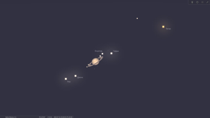 В телескоп хорошо видно широкое кольцо Сатурна и несколько крупных его спутников. Общее количество известных спутников Сатурна приближается к сотне, но в любительские инструменты видно лишь несколько. А самый крупный спутник Сатурна — Титан — хорошо заметен даже в бинокль.
