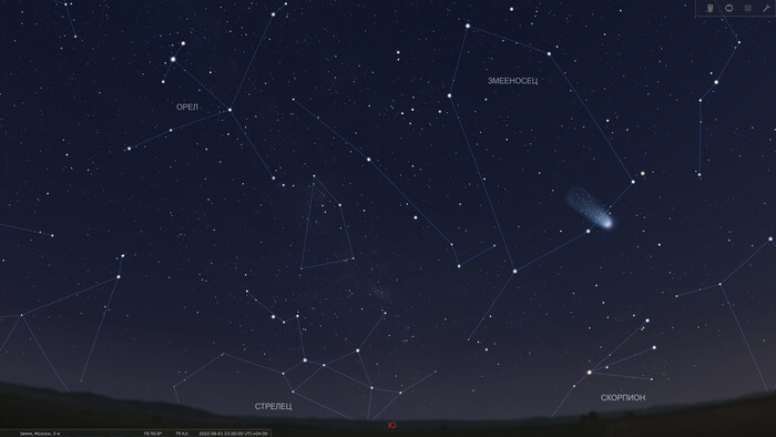 На границе Змееносца и Скорпиона в светосильную оптику можно заметить комету PANSTARRS (C/2017 K2) — её блеск близок к 8-й звездной величине. Кроме светосильной оптики потребуется еще и темное небо, открытый горизонт и некоторый опыт наблюдения диффузных объектов, которые наблюдать сложнее, чем звезды той же яркости.