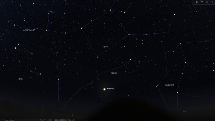 Еще час спустя поднимется Юпитер — ярчайшее светило этой ночи. Располагаясь на границе созвездий Кита и Рыб, Юпитер почти не меняет положения среди звезд — несколько суток назад состоялось стояние планеты, в результате которого Юпитер сменил направление видимого движения, но еще не набрал темп.