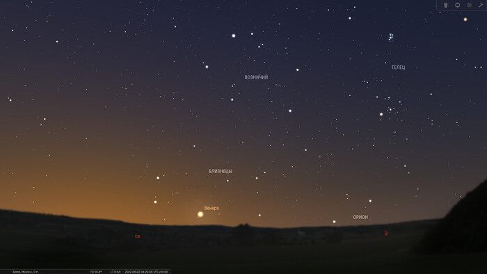 Под созвездием Возничего в утренних сумерках восходит созвездие Близнецов. Это зимнее созвездие, но период его видимости начинается в конце лета — в августе. Две его ярчайшие звезды — Кастор и Поллукс — успеют подняться на значительную высоту, прежде чем прямо под ними — на северо-востоке — зажжется очень яркое светило — планета Венера.