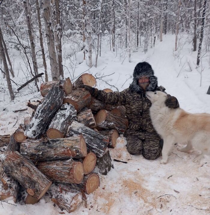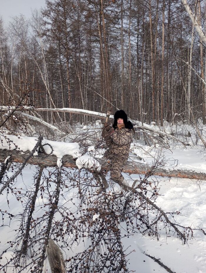 Моя миссия — максимально помочь Жене. Я рублю сучки, и, пока Женя распиливает ствол дерева на полешки, я складываю полешки в нарты и возле путика, чтобы их удобно было грузить в нарты.