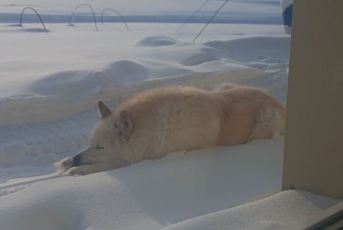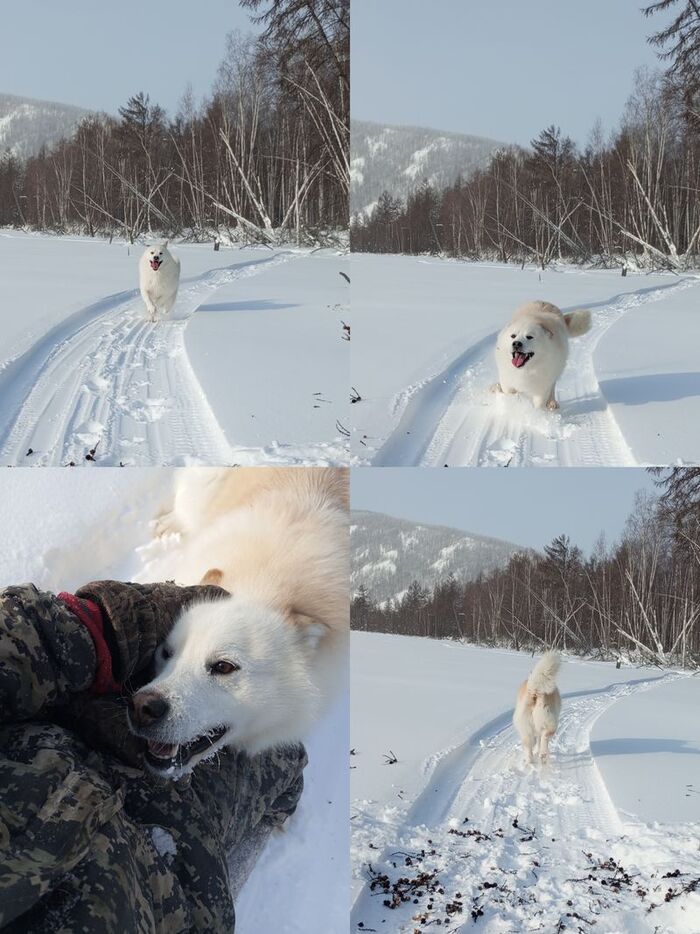 Он любит побежать впереди снегохода и пытаться быть быстрее максимально долго. Когда силы кончаются, он просто прыгает в снег и после этого бежит уже за снегоходом.
