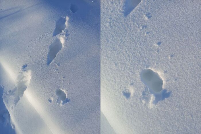 Это точно не Петрович, потому что он намного сильнее проваливается в снег. Отпечаток носа тоже не его, потому что слишком глубокий и узкий для мордочки Петровича.