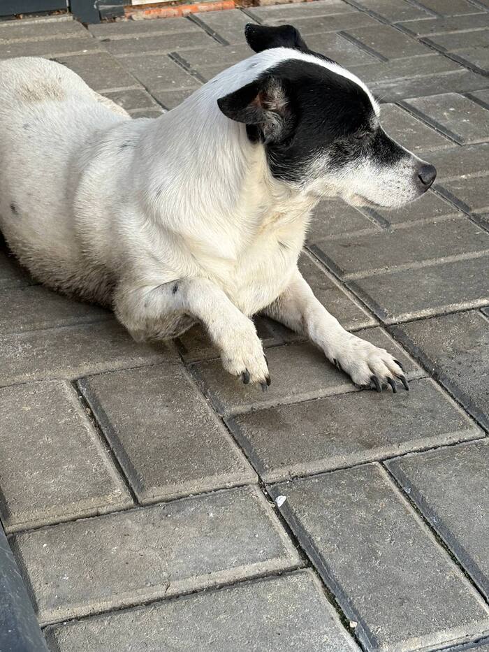 Собака в возрасте ~7 лет, метис джек-рассела, совсем маленькая и доверчивая. Белая с черными ушами и рябушками по телу.