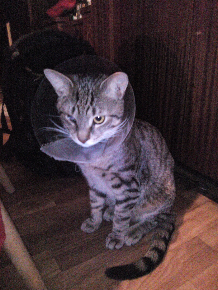 На определенном этапе, кстати, глаз пришлось еще лечить - он зачесался и Устин себе его люто расцарапал, молодец. Пришлось регулярно класть в глаз мазь (то еще дзюдо было), и ему пришлось сидеть в колпаке. Был недоволен.