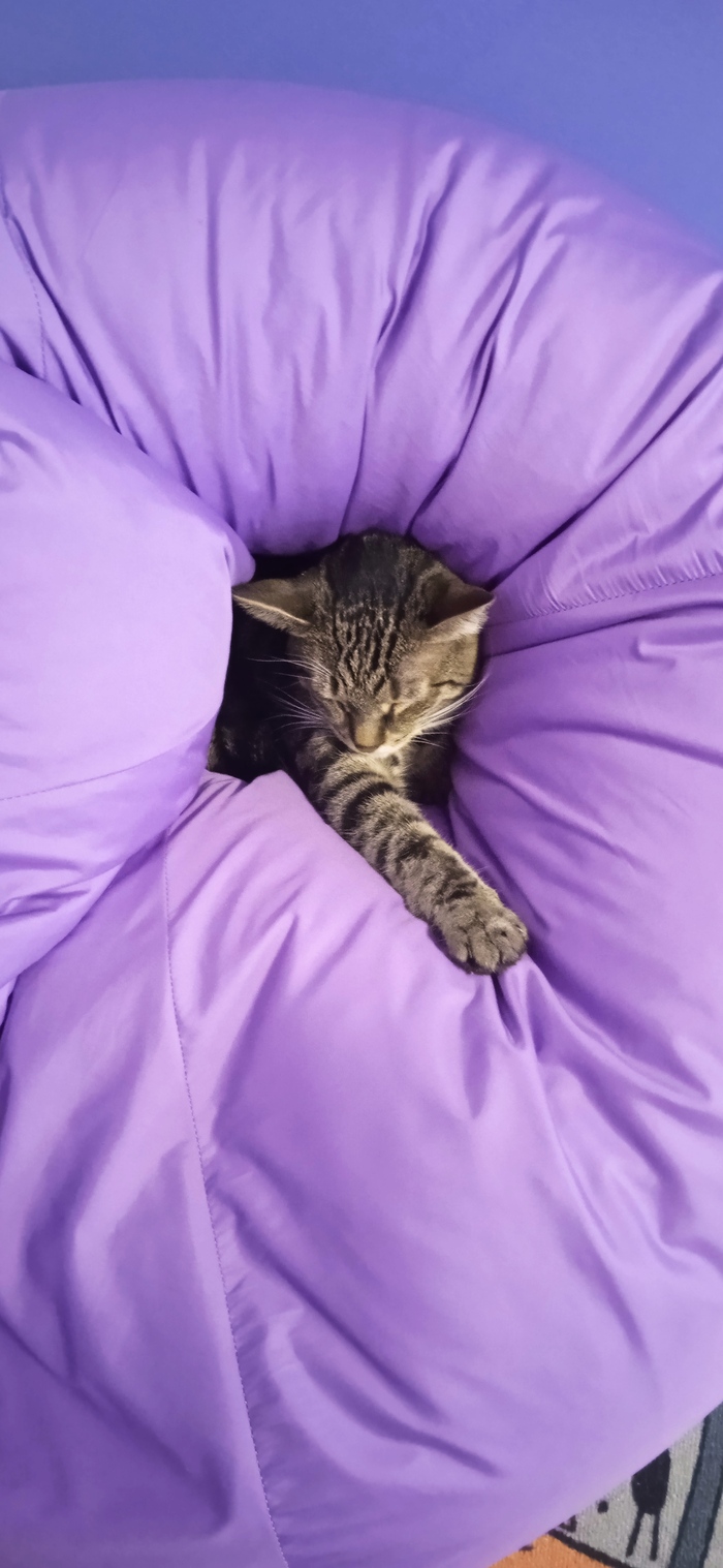 Кстати, о мурмурмур. Ни разу не видел такого урчащего кота: похоже, это его естественная реакция на почти любой стимул. Даже если стащить его с неположенного места - урчит. И часто, зараза, усыпляет, когда надо вставать, а он разлегся на тебе и мурчит. К слову, это очень частая картина, когда просыпаемся - и вот кот.