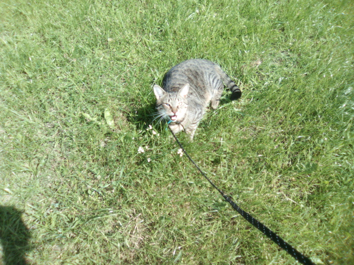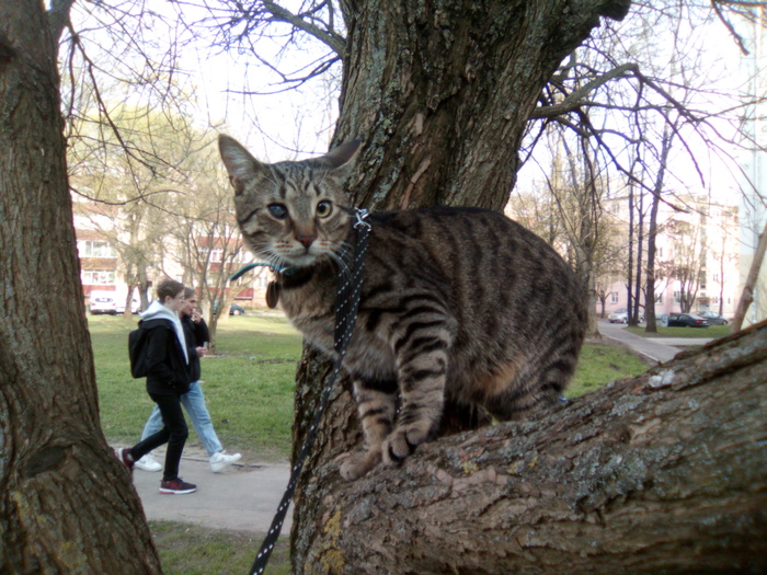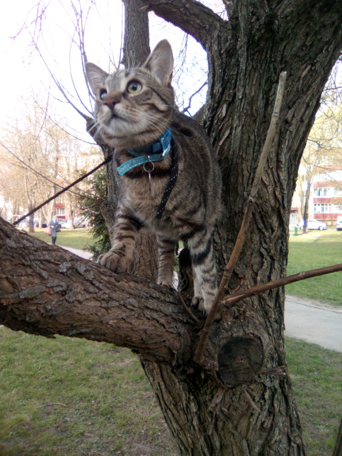 Кстати, энное количество раз вырывался на лестничную площадку и был отловлен. Впрочем, мы его все равно выгуливаем в теплое время, но только на шлейке. От собак и машин шарахается, пару раз пришлось его стягивать с дерева.
