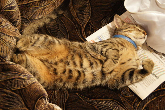 Устин крупный - полметра в длину теперь, не считая хвоста, и килограмм шесть весом. Но не жирный: спасибо бенгальской крови, все идет в мышцы. Конечно, как и любой кот, обожает поспать во всех мыслимых позах.