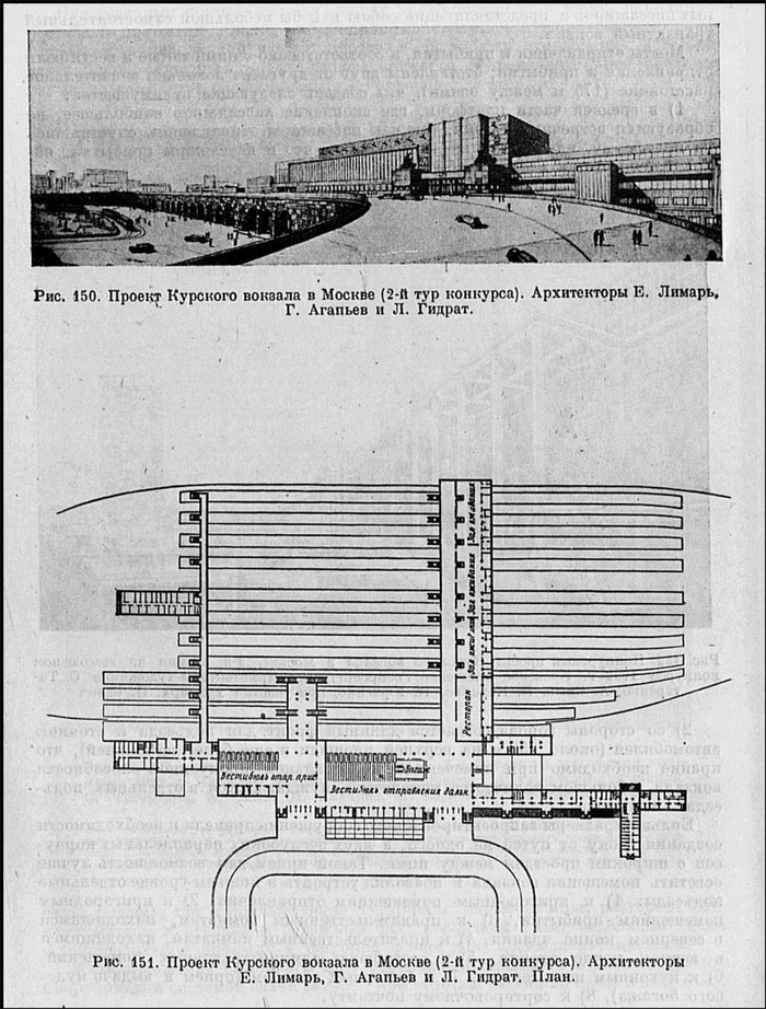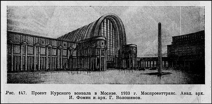 Интересен проект архитектора Ивана Фомина и его ученика Г. Волошинова. Они предложили поднять уровень земли под вокзалом, а над путями перекинуть огромную арку с полупрозрачными сводами.