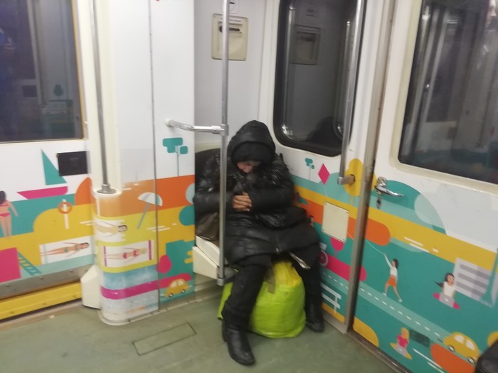 Так'с, а каким сдохшим мамонтом дерьмом тут воняет? Осмотримся по сторонам. О, и правда в конце вагона уютно расположилась женщина у которой жизнь не задалась. Другими словами - БОМЖ. И воняет от неё так, что аж глаза режет.