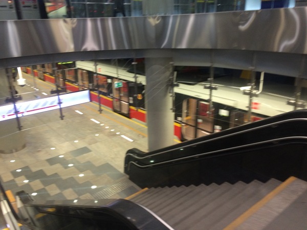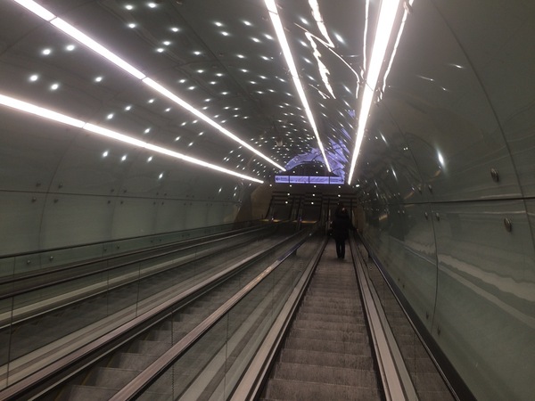 Это переход между ветками. Самодвижущиеся лестницы такие же, как в аэропортах, народу нет. Обращаю ваше внимание, что это понедельник, единственный переход между ветками, время около полудня.