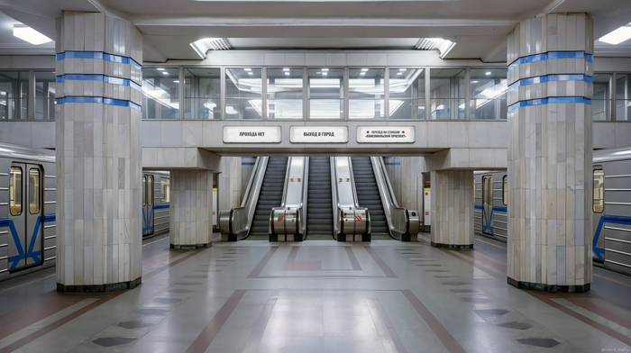 Освещение станции яркое, почти лабораторное — прямоугольные световые панели встроены в потолок и дают ровный белый свет, без теней. Всё здесь построено на ощущении порядка: пропорции, линии, материалы. Даже цвет поезда — металлический с синими вставками — будто подчеркивает технический стиль пространства.