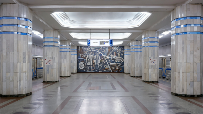 Станция строится в новом десятилетии, когда монументальность начала уступать место функциональности и свету. Зал отделан светло-серым мрамором с прожилками, создающим ощущение чистоты и точности — будто лаборатория или цех нового поколения. Сверху колонн проходят полосы кобальтового цвета — акцент на инженерный характер станции, символ точности и технологии.