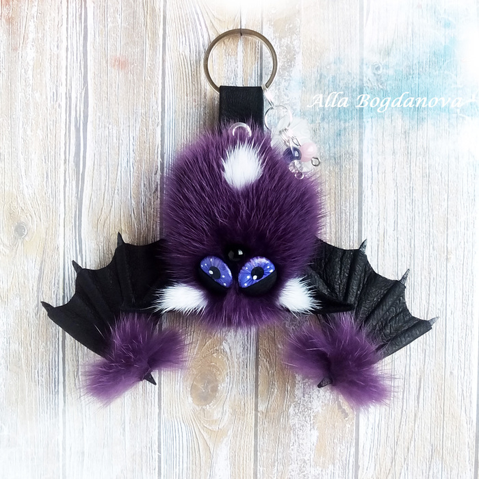 По размеру получился что-то около 38 см в длину. На всю работу ушло дней 5 и просушка. Использовала натуральную кожу, мех норки белый и графит, глазки из бисера, леска. Внутри проволочный каркас, можно согнуть где нужно. Роспись акриловыми красками. Тут хоть без перехода цвета, намешивала нужный и постепенно участками красила. Мелкие детали расписывала до пришивания к телу, а всё остальное уже в собранном виде. Сзади у него какие-то усики, сделала их из лески и на кончиках ромбики кожаные.
