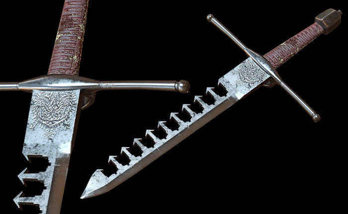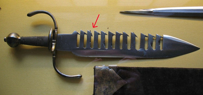 Зловещего вида зубья, вопреки расхожему мнению, не были инструментом дополнительного травмирования. Их задача – удерживать в своей хватке клинок противника, лишая его подвижности и заставляя открыться для ответного удара. Для этого края зубьев часто делали скошенными, как у рыболовных крючков: по такой грани лезвие легко скользнет в выемку, а вот высвободиться из нее сможет лишь под правильным углом.