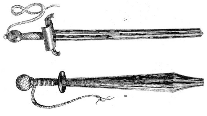 Оружие турнирного бойца (рис. 15) — меч и булава. Меч затуплен, т. е. не имеет ни острия, ни лезвия; это просто плоский железный брус с долом, выдолбленным по оси клинка на треть его длины, и с ребром, идущим от дола. Концы перекрестья выгнуты к острию и усилены жесткой железной гардой в форме полуцилиндра. Длина клинка вместе с рукоятью должна равняться длине вытянутой руки (0,7 м). Клинок (чтобы не мог пройти в отверстие забрала) должен быть шириной в четыре пальца и толщиной — в палец; для уменьшения веса делался дол.