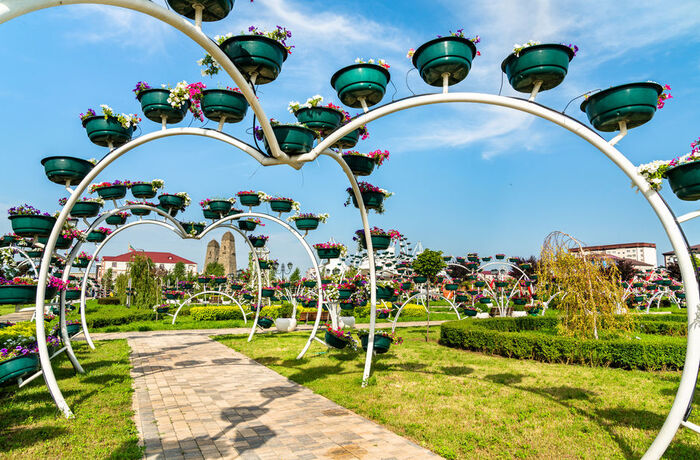 Рядом с городом бетонных небоскрёбов Грозный-сити находится живописный парк — Цветочный. Он совсем не похож на стандартные дендрарии и розарии с лужайками и клумбами. Цветы здесь растут в горшках, подвешенных на металлические арки-сердца разной высоты и размеров. Яркие цветочные композиции также украшают поверхность металлических пирамид, имитирующих средневековые боевые башни.