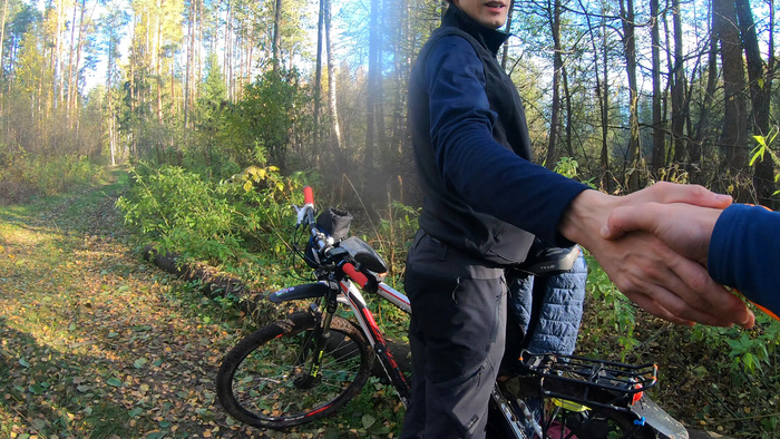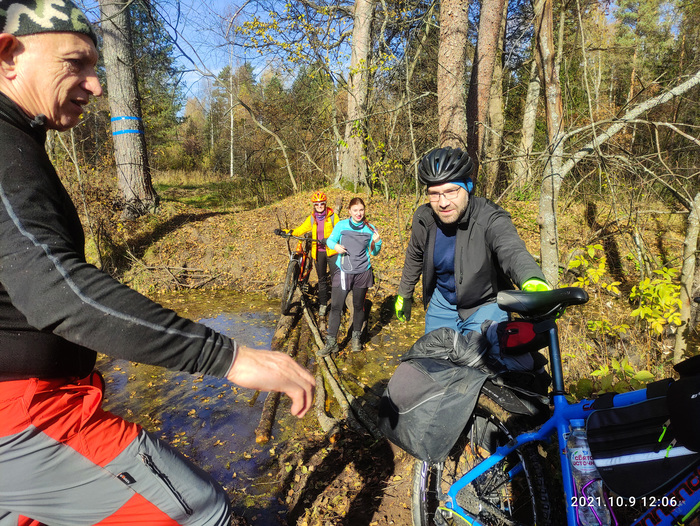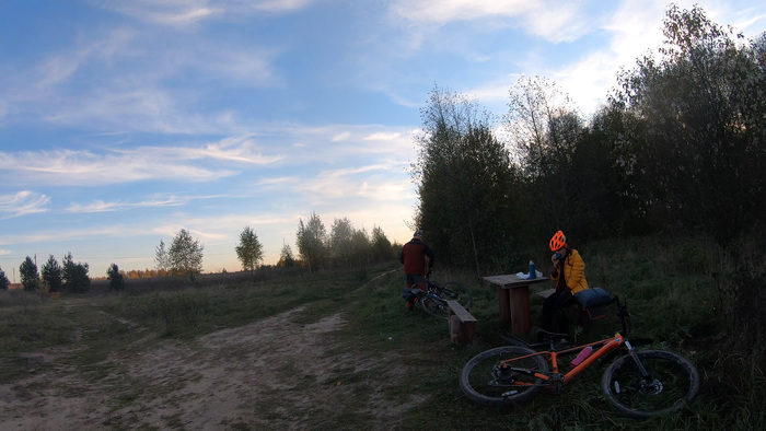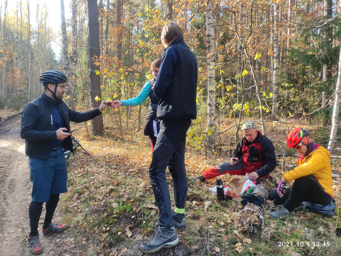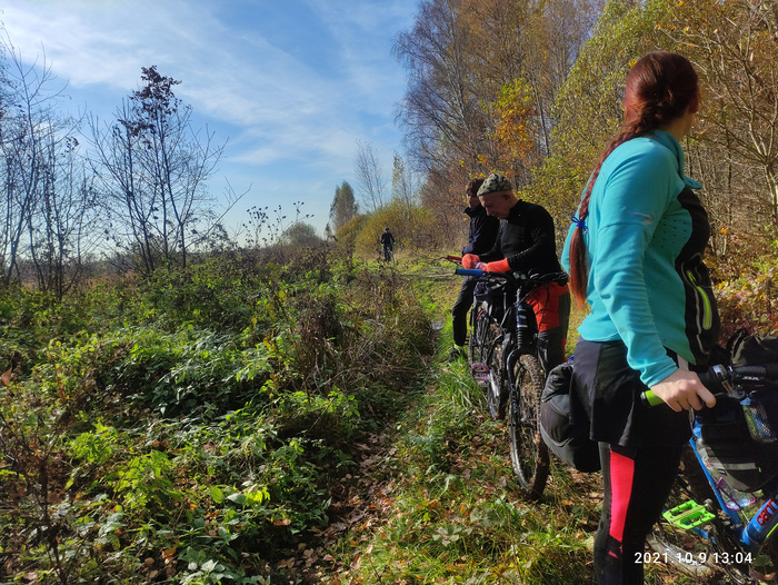 Всё так же едем втроем в пределах видимости, иногда разъезжаясь и снова догоняя друг друга. На 100_м километре остановились для зеленой остановки и немного перекусить. Тут выяснилось, что кабель для зарядки телефона я оставил в номере… Хорошо, что все это время мой телефон был выключен, т.к. пользовались навигатором Иры. А так бы помимо педали, я б лишился еще и навигации посреди маршрута, а без неё было бы сложно выбраться из леса по этой хитросплетённой сети дорожек и троп.