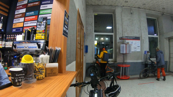В 18:50 уже в сумерках въехали в пос. Уршельский, где почти на самом въезде обнаружили пафосное такое кафе! Круто и неожиданно для деревеньки среди болот и лесов! Как хотелось остаться там и плотно поужинать) Но по опыту знаю, что это чревато большой потерей времени, да и желудок потом будет давить на глаза, особенно в ночное время. Поэтому лучше ехать вперёд! Фотаемся у КП, едем в магаз за водой и перекусом. Там же встречаем Диму из 3х9. Через некоторое время прикатывает пара на фэтах — у них по дороге отломился багажник, но его удалось починить.