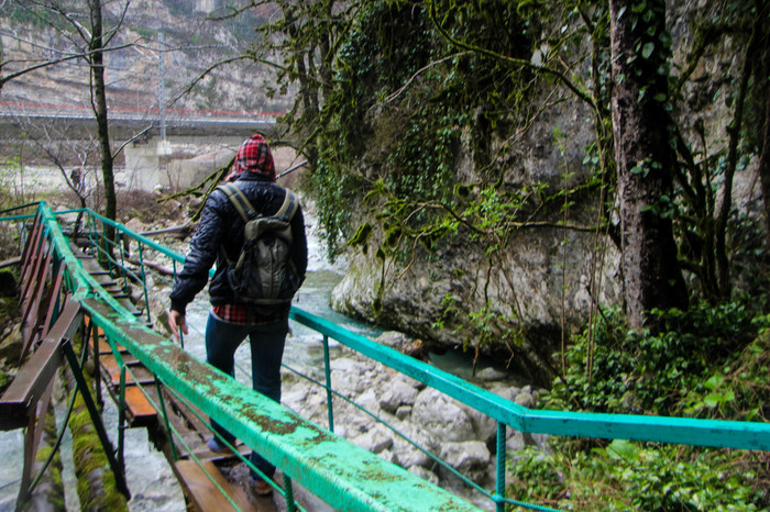 Пройдя мимо придорожного кафе, мы увидели указатель на водопад со стрелкой. Убедившись в том, что идём в правильном направлении, мы спустились вниз и оказались возле большой асфальтированной площадки. Пройдя её с правой стороны, мы обнаружили старый железный мост. В некоторых местах мост был укреплён металлическими стяжками, но всё равно выглядел опасным. Перейдя по нему через бурную реку Мзымта, мы повернули направо и стали идти вдоль течения горной реки.
