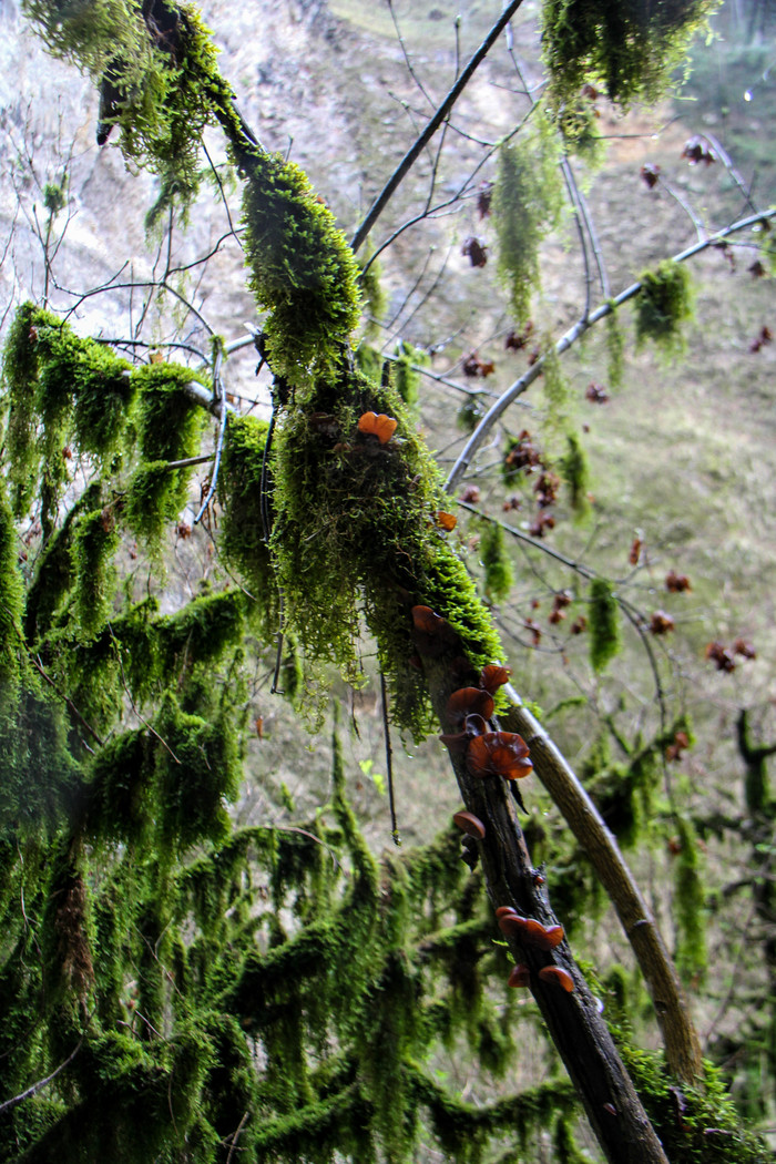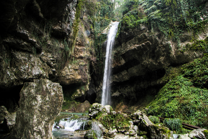 Перейдя, наконец, речку, мы вышли к лесной тропинке, тянущейся тонкой полоской вверх. Получив свою порцию адреналина, я бодро зашагала вслед за Мишкой, и буквально через несколько десятков метров мы увидели перед собой небольшой железный мостик, который вывел нас к узкой тропе, оборудованной деревянными лестницами с металлическими перилами. Именно отсюда начиналась основная дорога к водопаду, идущая вдоль необыкновенно прекрасного ущелья Глубокий Яр. Над головой с одной стороны нависают скалы, с другой – зелёной стеной стоят древние деревья, поросшие изумрудным мхом, а внизу бурлит горная река с огромными валунами. Зрелище просто фантастическое!