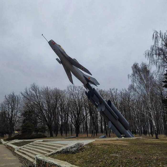 Первоначально самолёт должен был стоять на постаменте. Однако при обсуждении проекта членам комиссии такой вариант не понравился, по причине " отсутствия динамики и стремительности полета". В итоге конструкторы трубного завода нашли удачное решение - боевая машина установлена на стальных трубах диаметром - 530, 830 и 1200 мм, вмонтированных в железобетонное основание и символизирующих след от реактивного самолёта.