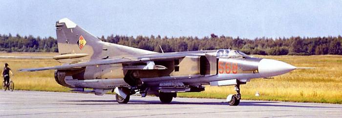 Истребитель МиГ-23 в варианте истребителя-бомбардировщика МиГ-27 одной из строевых частей ВВС СССР