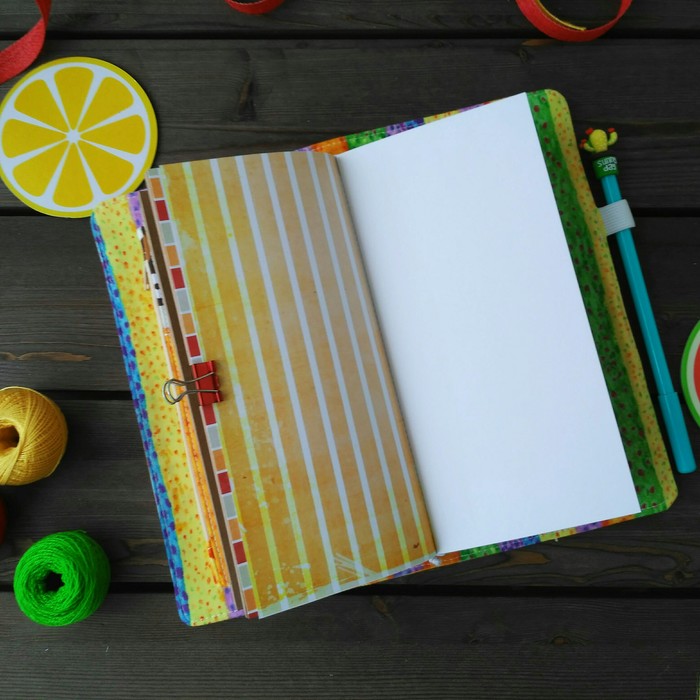 Внутри скрепки для всяких бумажек. Яркая ручка в той же цветовой гамме+ ручка с белыми чернилами для крафт-бумаги в подарок.
