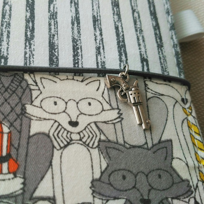 Так понравился этот рисунок с любимым Тоторо! Конечно же, ткань-компаньон и украшения должны соответствовать теме мультика. Использовала подвески в виде дерева и зонтика, а ткань внутри с рисунком облаков и дождя. Жаль, котобуса не нашлось.