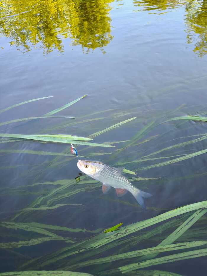 Наблюдал голавля, язя, плотву и краснопёрку. Всех пробовал ловить, но осень берет своё и белого хищника, на спиннинг, ловить все сложнее. Зато зелёный хищник не подвёл, жрёт всё что может. Жаль более крупных приманок с собой не было.