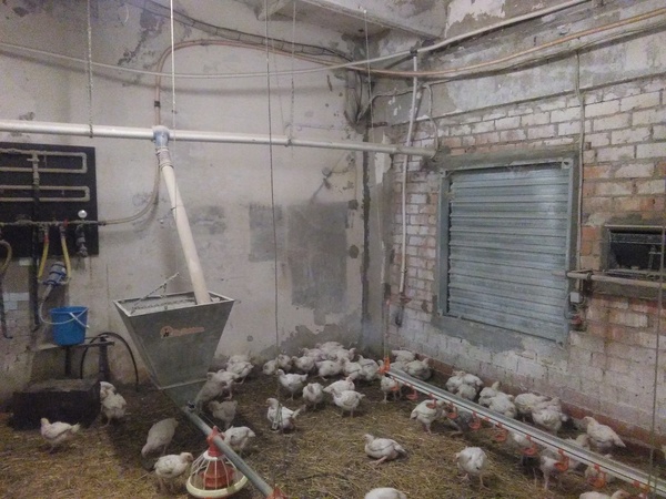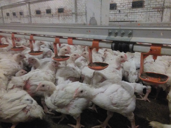 Корм ежедневно производится на местном кормозаводе, привозится кормовозами в уличный бункер на 3 тонны, внутрь птичника закачивается наклонным и горизонтальным шнеком в 3 бункера на 3 кормолинии. (На многоэтажных птичниках 4 бункера, по одному на каждый этаж. На 2,3,4 этажи закачивается "Норией", в остальном так же, только там 6 кормолиний на кадом этаже.)