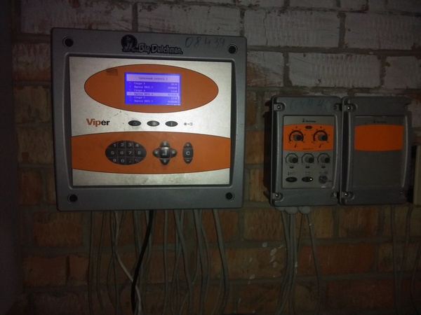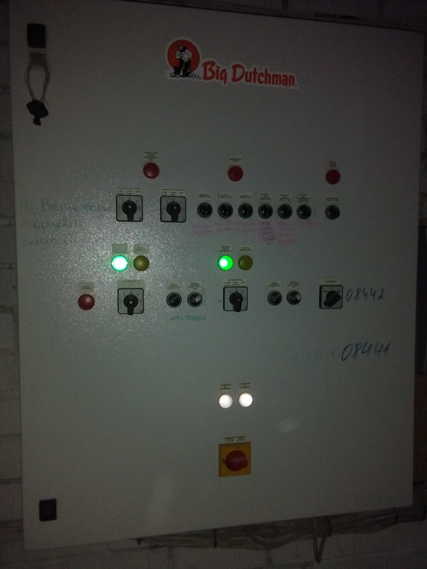 Вот он сам Вайпер))) К нему сводятся все датчики, сервопривода, внутри много много реле, которые подают фазу на катушки пускателей почти всего электрооборудования. Из датчиков подключаются: датчики температуры (перед, середина, зад), датчик влажности (включает выключает увлажнение по потребности), датчик давления, разряжения, включается-выключается освещение по расписанию, так же настраивается яркость ламп(кое где обычные лампы дневного света, желтые, с блоком управления яркости, а кое где специальные светорегуляторы со свтодиодными лампами на 24 в, которые более эффективны) Кое где подключают инновационные решения: это тензодатчики уличных кормобункеров, весы для птицы (вычисляет средний вес птицы), датчики CO2, возможность удаленного мониторинга и много всяких шняг. Справа блок сигнализации (реагирует на перегрев или низкую температуру - к нему подводятся дополнительные датчики температуры), еще правее в безликом ящике аккумулятор сигнализационного блока, который будет питать сигнализацию, если пропадет энергоснабжение птичника. Сирена на 12 В, она где то спрятана под крышей. Довольно громко пищит. Так же Он задает потребность вентиляции частотному преобразователю, который задет частоту вращения одному торцеому (маленькому) и боковому среднему вращение. Всего боковых вентиляторов 3, первый и третий управляется через viper.