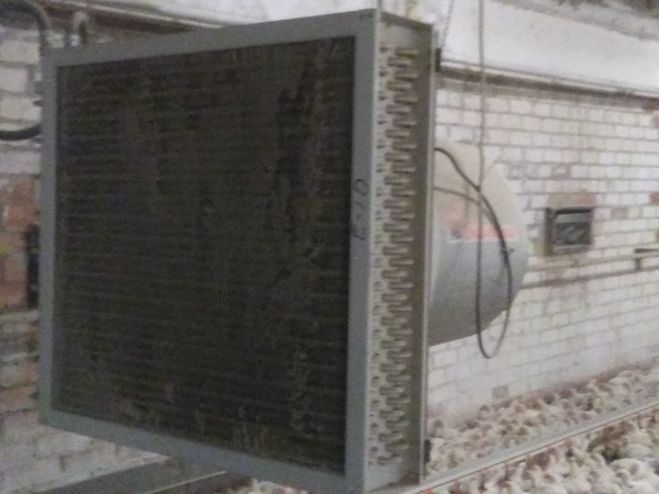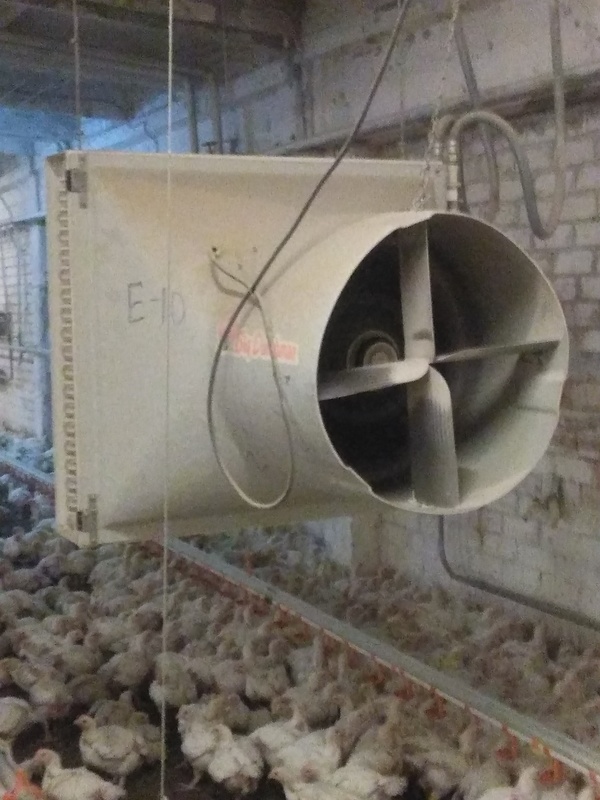 Отопление птичника идет круглый год. Даже летом. Кроме обычных радиаторов и регистров, температура в птичнике нагнетается вот такими вот "теплопушками", которые называют у нас в простонародье "Хит мастер"(бурж. Heat Master). К нему подводится отопление, а с обратной стороны выдувается горячий воздух. Всего их 6 в птичнике, и дуют они в разные стороны в шахматном порядке. (Хит мастера используют в одноэтажных птичниках, в многоэтажках приточные камеры). Да да, покрыт пылью. Можно включить реверс и он выдует всю пыль, но не стоит.
