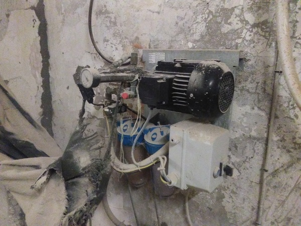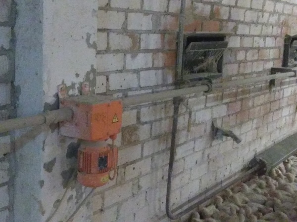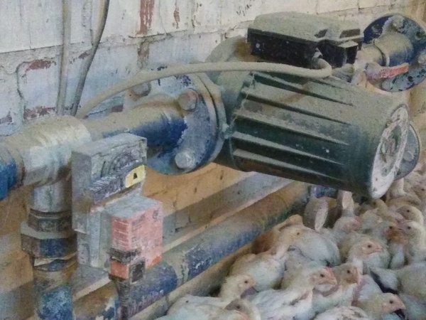 Кроме температуры и вентиляции (вытяжные вентиляторы я Вам уже показал), в птичнике поддерживается влажность воздуха, вода нагнетается этим насосом в тоненькие трубы и распыляется через форсунки по всему птичнику. (Да, да, грязно и покрыто пылью - но ничего, через 2 недели птиц отправят на убой и начнется очистка, ремонт, ТО, дезинфекция и прочие программы, между убоем и заселением, этот промежуток времени называется "сан.разрыв". Так же, летом, служит охлаждением, когда цыплята маленькие, и "подкулинги" еще нельзя включать.
