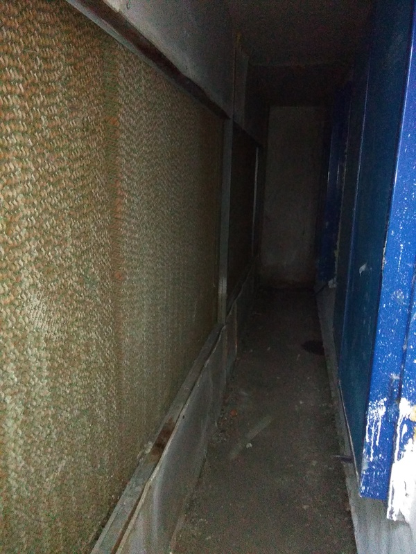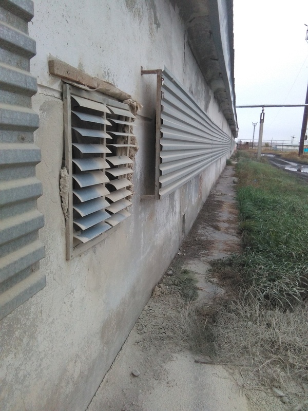 Вид сбоку, возле одного из трех боковых, регулируемых по частоте вращения вытяжных вентиляторов. За металопрофилем находятся клапана бокового притока воздуха с улицы. Вы можете заметить, как ставни покрыты слоем пыли, а так же пространство под вентилятором. Зимой там реально "Черный снег")))