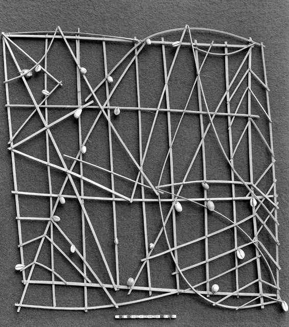 у микронезийцев были и своеобразные морские карты или, точнее, 'морские макеты'. делались эти макеты из прутьев и прожилок пальмовых листьев. переплетениями таких прутьев и прожилок обозначались морские течения; острова отмечались на макетах белыми раковинами. такие макеты, очевидно, использовались как учебные пособия, по которым азы навигационного дела изучали юные мореходы.