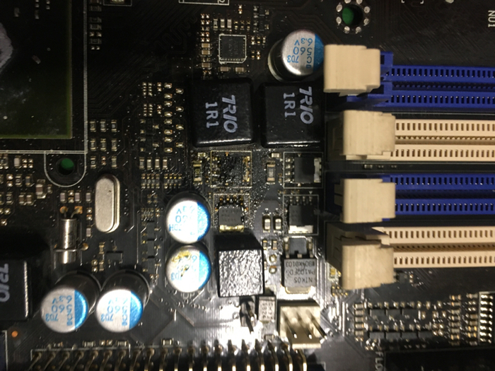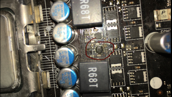 Дросселя и мосфеьы заменены на новые . Но при включении он просто не хотел запускаться, только крутились вентиляторы и он комп сам выключался. Снова снял все радиаторы и при осмотре была обнаружена сгоревшая микросхема в районе фаз питания процессора.
