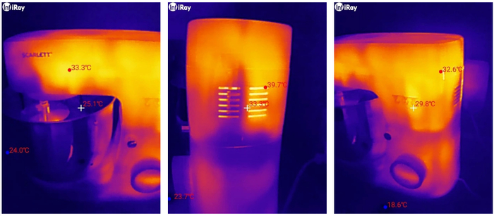 После замешивания теста провел замер температуры корпуса, чтобы оценить, как греется электродвигатель при длительной работе. Нагрев незначительный и не повлияет на работу устройства. Максимально по показаниям прогрелся электродвигатель до 40 градусов, а также редукторная часть до 33 градусов.