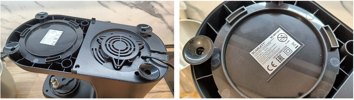 На нижней части множество вентиляционных отверстий для отвода тепла от двигателя. Есть направляющие для хранения провода питания, который кстати длиной всего 1 метр. Сечение жил 0,75 мм2, что вполне достаточно для кратковременной работы планетарного миксера на полную мощность. Миксер надежно удерживается на столе за счет присосок.