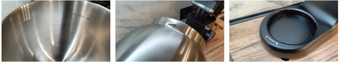 Черный корпус планетарного миксера выглядит привлекательно, но на нем будут видны следы от продуктов. К примеру, это может быть мука. Также отчетливо видны следы на чаше, хотя она и изготовлена из нержавеющей стали.
