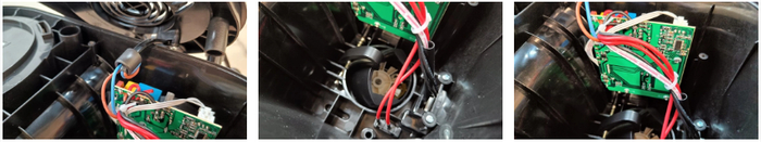Провод питания с ферритовым фильтром. Соединение проводов частично выполнено с использованием штекеров и пайки, а в дальнейшем залиты термоклеем. На двигателе видна пластиковая крыльчатка для охлаждения. Видно, что направляющая верхней части выполнена на основе металла, что добавляет жесткости и надежности конструкции. До двигателя добраться можно, но придется "раскидать" полностью весь корпус.