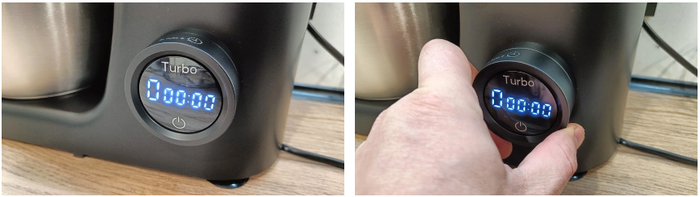 Включение миксера за счет кратковременного нажатия на сенсорную кнопку. После чего, загорается экран устройства. Если продукты в чаше, то можно включать. Вращение регулятора по часовой стрелке добавляет режим работы на +1, вращение в обратную сторону убавляет на -1. Если зажать длительно, то можно будет настроить таймер.