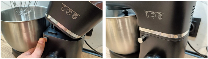 Кнопка на корпусе, чтобы поднять верхнюю часть. Нажимать следует после полной остановки вращения, но даже если вы нажмете раньше, миксер прекрати вращение.