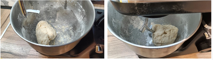 Включаем планетарный миксер и лишь контролируем процесс. После пары минут работы получаем однородную массу, которая с легкостью отстает от стенок чаши. Я затратил на замешивание теста буквально несколько минут. При это руки оказались совершенно чистыми.