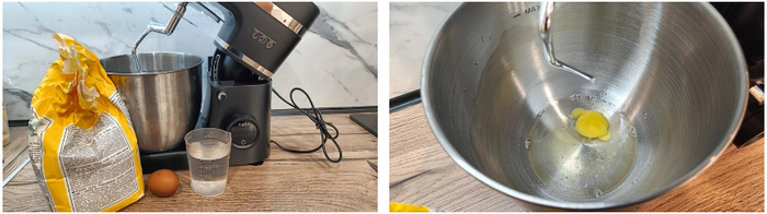 Также хочу показать, как замешивается пельменное тесто. Оно наиболее твердое и его сложно месить в ручную, чтобы получить однородный слой. Будем готовить по классической рецептуре. Для этого нам потребуется 1 яйцо, 500 грамм муки и 250 мл воды. Набираем воду, яйцо и соль в чашу. Перемешиваем крюком и лишь потом добавляем муку.