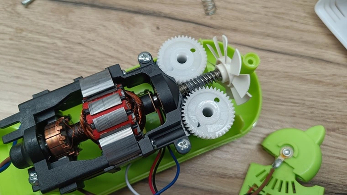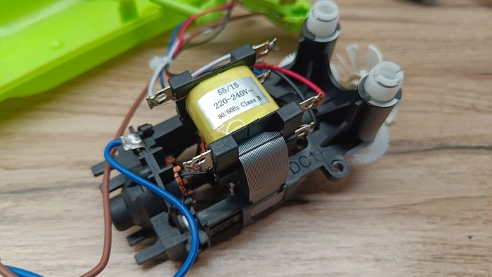 Конечно же, мне захотелось узнать, что находится внутри этого компактного миксера. Чтобы его разобрать, придётся выкрутить три самореза с нижней платформы устройства. Внутри размещается щёточный электродвигатель, механизм регулировки оборотов и держатели насадок. Точной маркировки электродвигателя я не нашёл. Сам электродвигатель удерживается на корпусе за счёт трёх саморезов. Центровка за счёт втулок скольжения. Основной вал - металлический, на конце которого пластиковый вентилятор охлаждения.