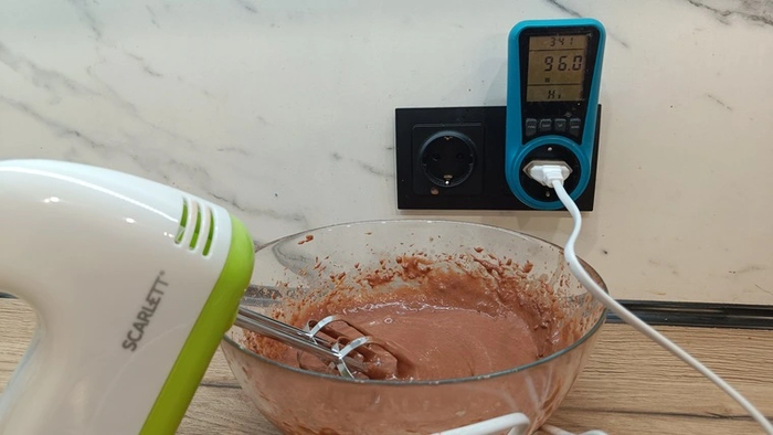 Начнём проводить замеры с измерения потребляемой мощности. Производителем заявлен номинальный режим в 150 Вт. При минимальной скорости электрический миксер потреблял около 72 Вт, а на максимальном в режиме работы, потребление составило около 100 Вт.