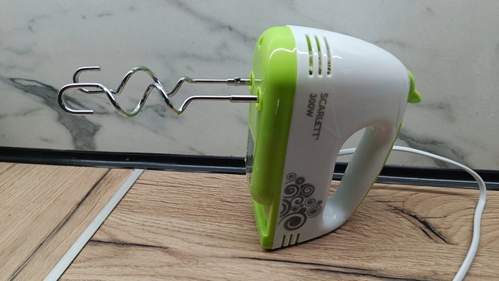Электрический миксер Scarlett SC-HM40S05 выполнен в классической форме с цельной ручкой. Питающий провод около 1 м с сечением проводов 2х0.5мм2. Этого более чем достаточно для заявленной мощности.